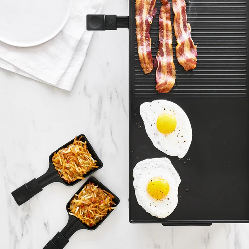 Dit gourmetstel voor 8 personen heeft een gegoten aluminium plaat met twee functies: een grill- en