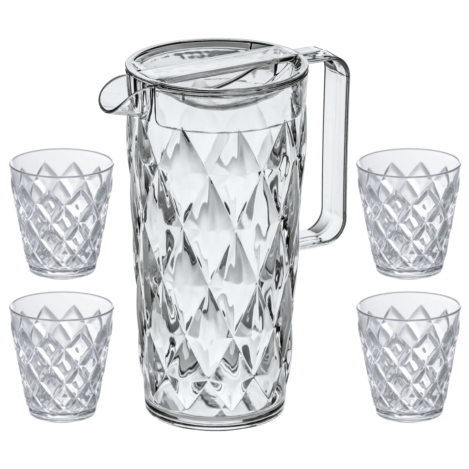 Schenk een verfrissend glas water met de Koziol Schenkkanf Crystal 1.6 Liter. De schenkkan wordt geleverd met 4 bijpassende Waterglazen van 250 ml. De karaf en waterglazen zijn gemaakt van Superglass, een onbreekbare gerecyclede kunststof. Daardoor kun je de glazen en schenkkan ook prima buiten gebruiken. Na gebruik kan de hele set ook worden gereinigd in de vaatwasser.