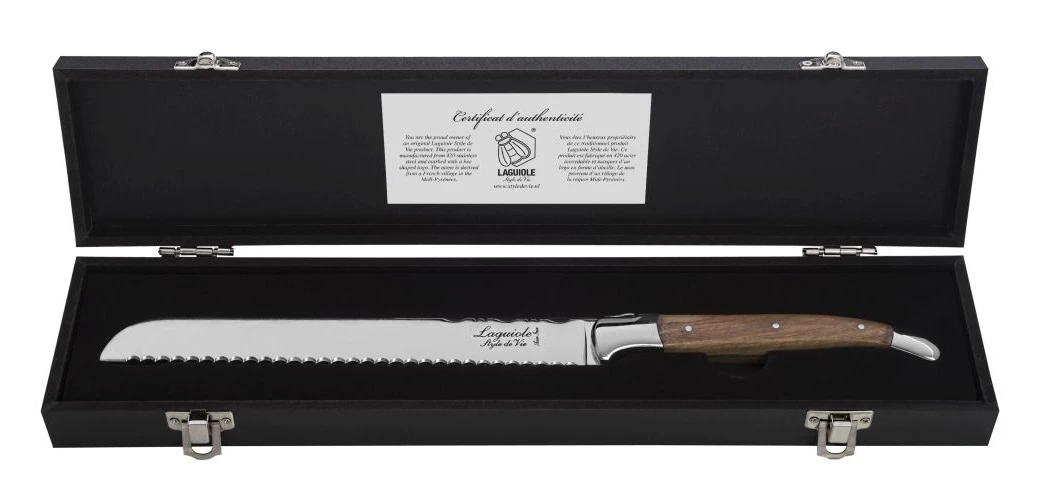 Dit broodmes van Laguiole Style de Vie heeft een lemmet van 2.5 mm en wordt geleverd in een luxe zwart kistje. Het mes is gemaakt van hoogwaardig RVS en olijfhout.