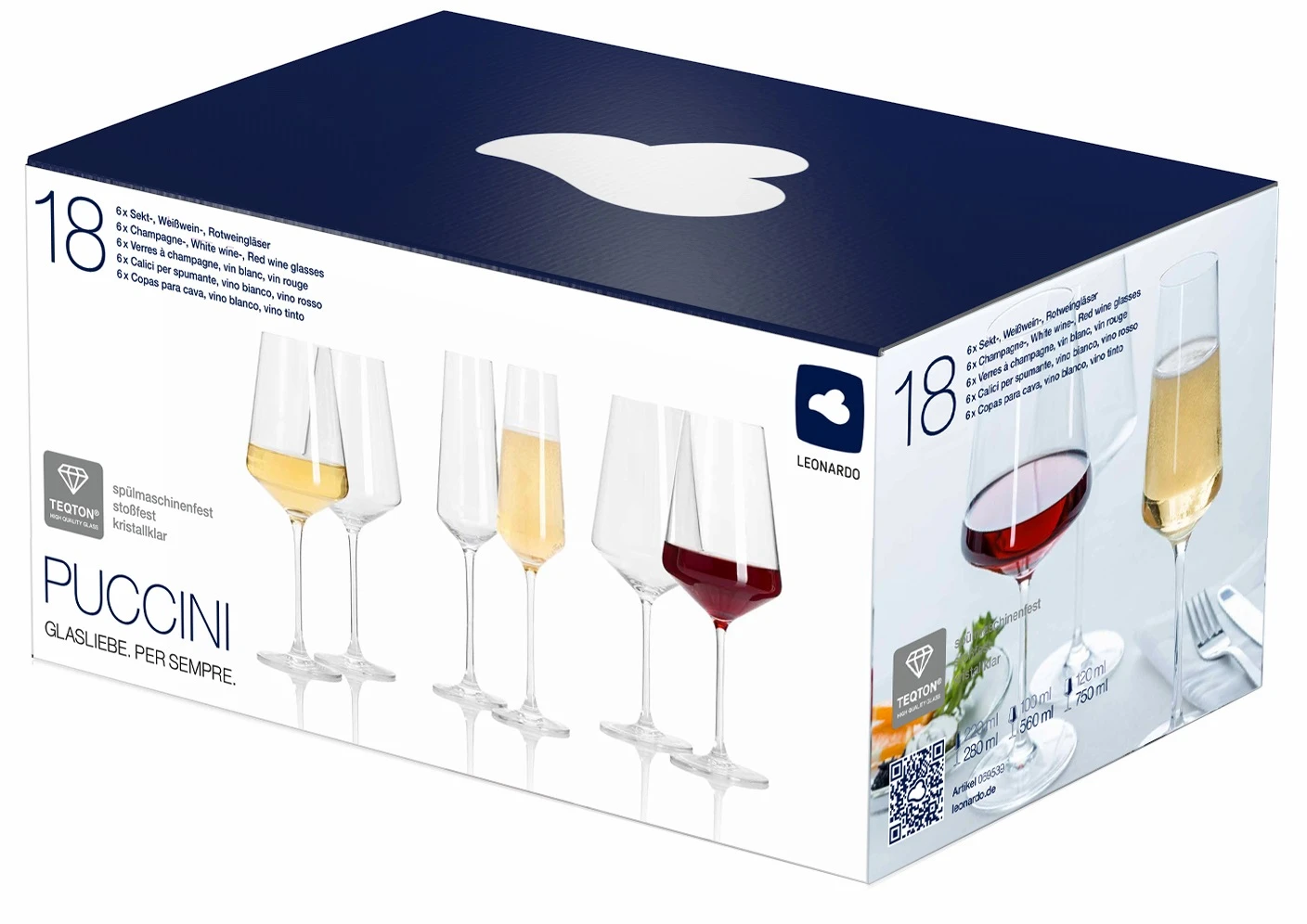 De Puccini collectie van Leonardo is klassiek, tijdloos en uniek. Het materiaal van deze glazen is TeQton. Dit glassoort zorgt ervoor dat de glazen niet alleen kras- en breukbestendig zijn, maar ook vaatwasserbestendig. Naast deze twee voordelen is een blijvende helderheid gegarandeerd! De glazen zijn zo gevormd dat er altijd precies voldoende zuurstof bij de wijnen komt, hierdoor zal je wijn altijd op zijn best worden gedronken.