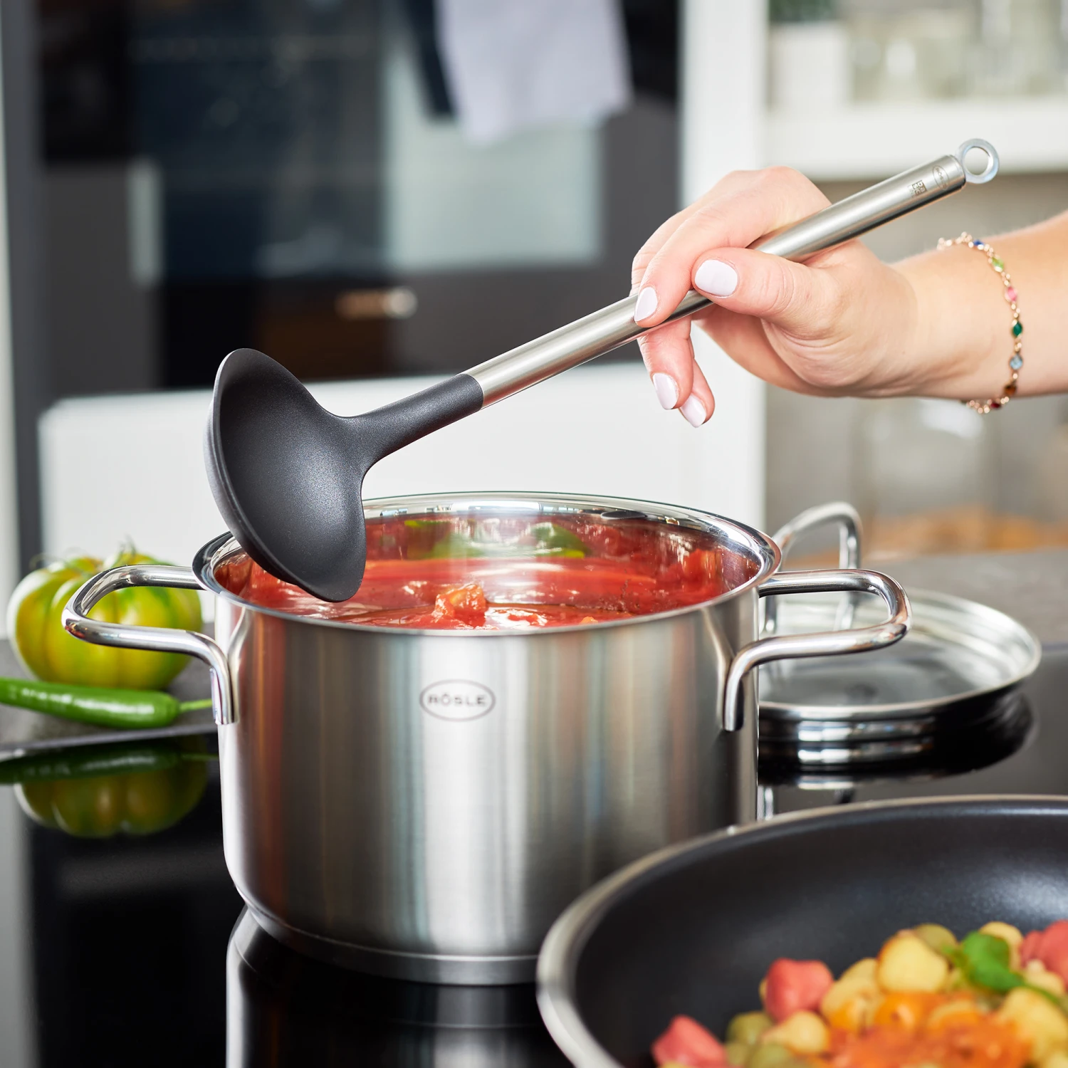 Ben jij een echte keukenprins of -prinses, dan mag een sauslepel niet missen in je keuken. De Rosle Basic Line Sauslepel – RVS / Siliconen – 28 cm is ideaal bij het serveren van lekkere gerechten. De sauslepel is gemaakt van 18/10 roestvrij staal en heeft een lengteย van 28 cm. Door de praktische ophanglus is hij gemakkelijk op te bergen en met de siliconen laag maak je minder snel krassen in je pan. Na gebruik kan de sauslepel gereinigd worden in de vaatwasser.