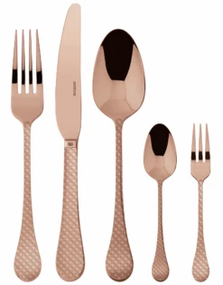 Klassiek, rustig en geïnspireerd door modetrends, dat is wat de Sambonet Taormina collectie is. Het bestek uit deze collectie wordt gekenmerkt door de print op de handvaten. Taormina is een verfijnd, modieus en tijdloos bestek wat prachtig staat op elke tafel. Verkrijgbaar in de bekende Sambonet kleuren en dankzij de PVD Coating is dit bestek extra stevig, kleurvast en 100% vaatwasserbestendig.