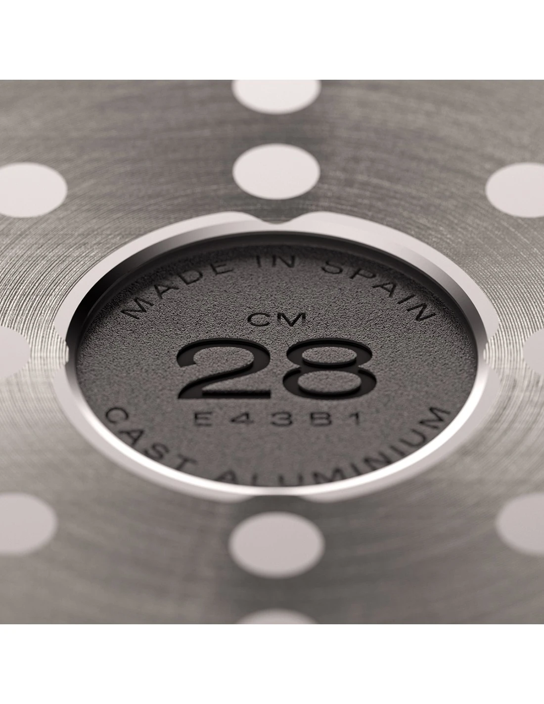 Deze Hapjespan is gemaakt in Reus (Spanje) met 100% gerecycled duurzaam en niet vervormbaar gegoten aluminium. De Hapjespan is geschikt voor alle warmtebronnen, inclusief inductiekookplaten. Daarnaast is de Hapjespan ovenbestendig tot 260ºC, inclusief de roestvrijstalen zijgrepen